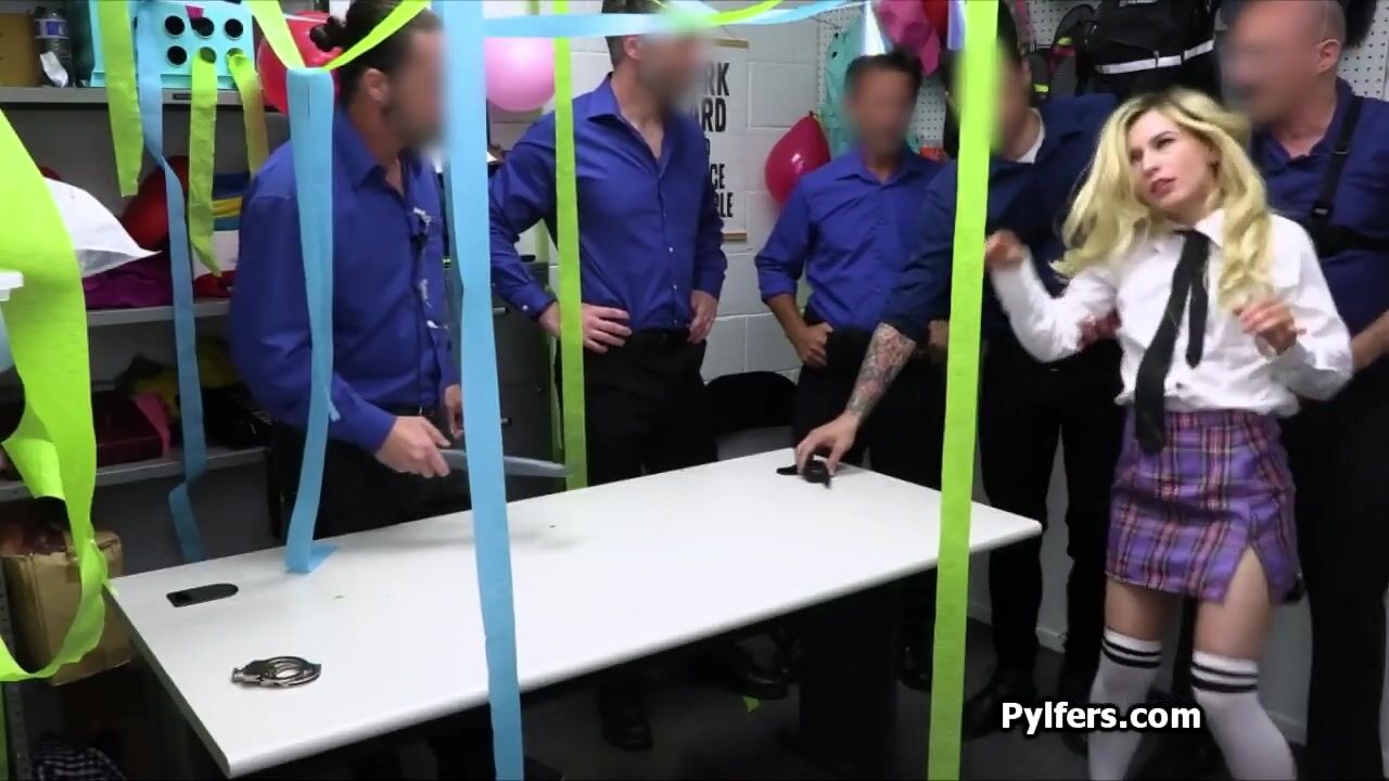 Seems like one of the security guards is saying goodbye, however a hot blonde ends up in the office. Just in time for a perfect gangbang party!