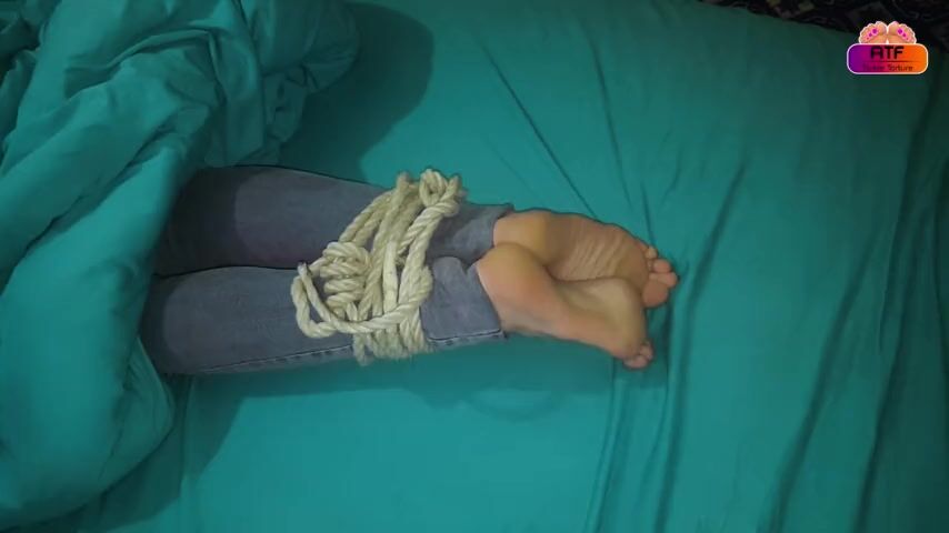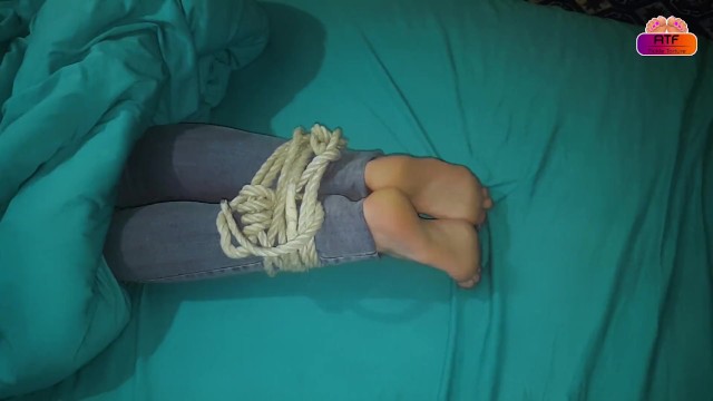 Tickling wife's tied feet in the bed